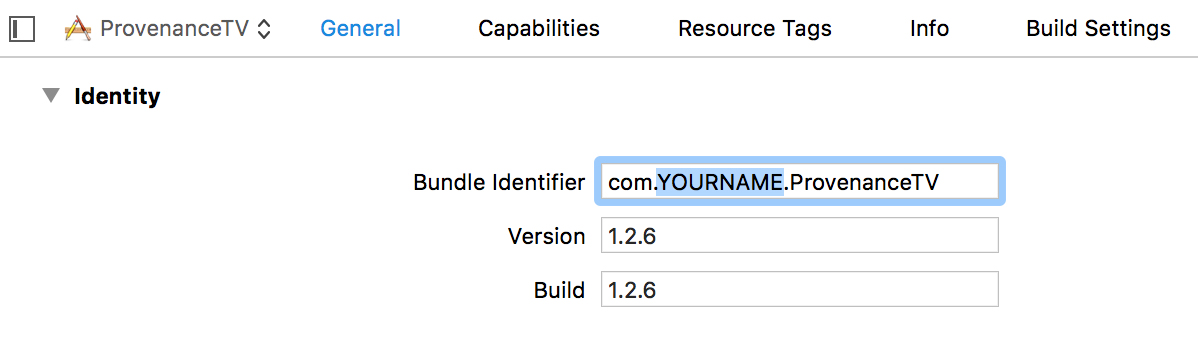 10. Change Bundle Identifier from ‘com.jamsoftonline.Provenance’ to com.YOURNAME.Provenance (you can enter anything else in place of YOURNAME)